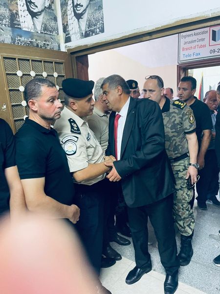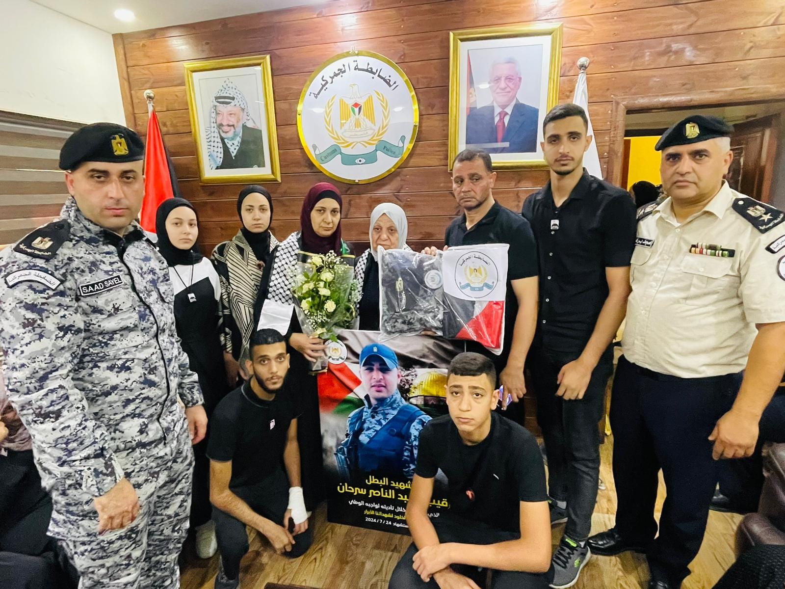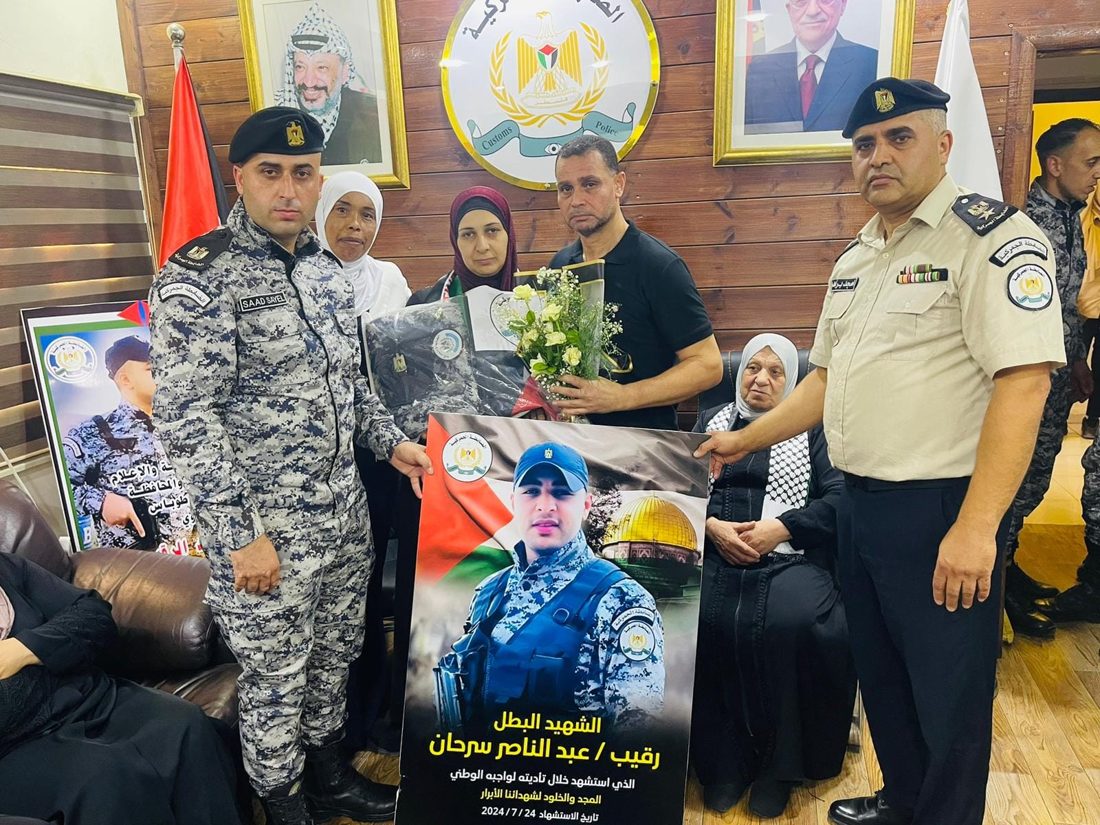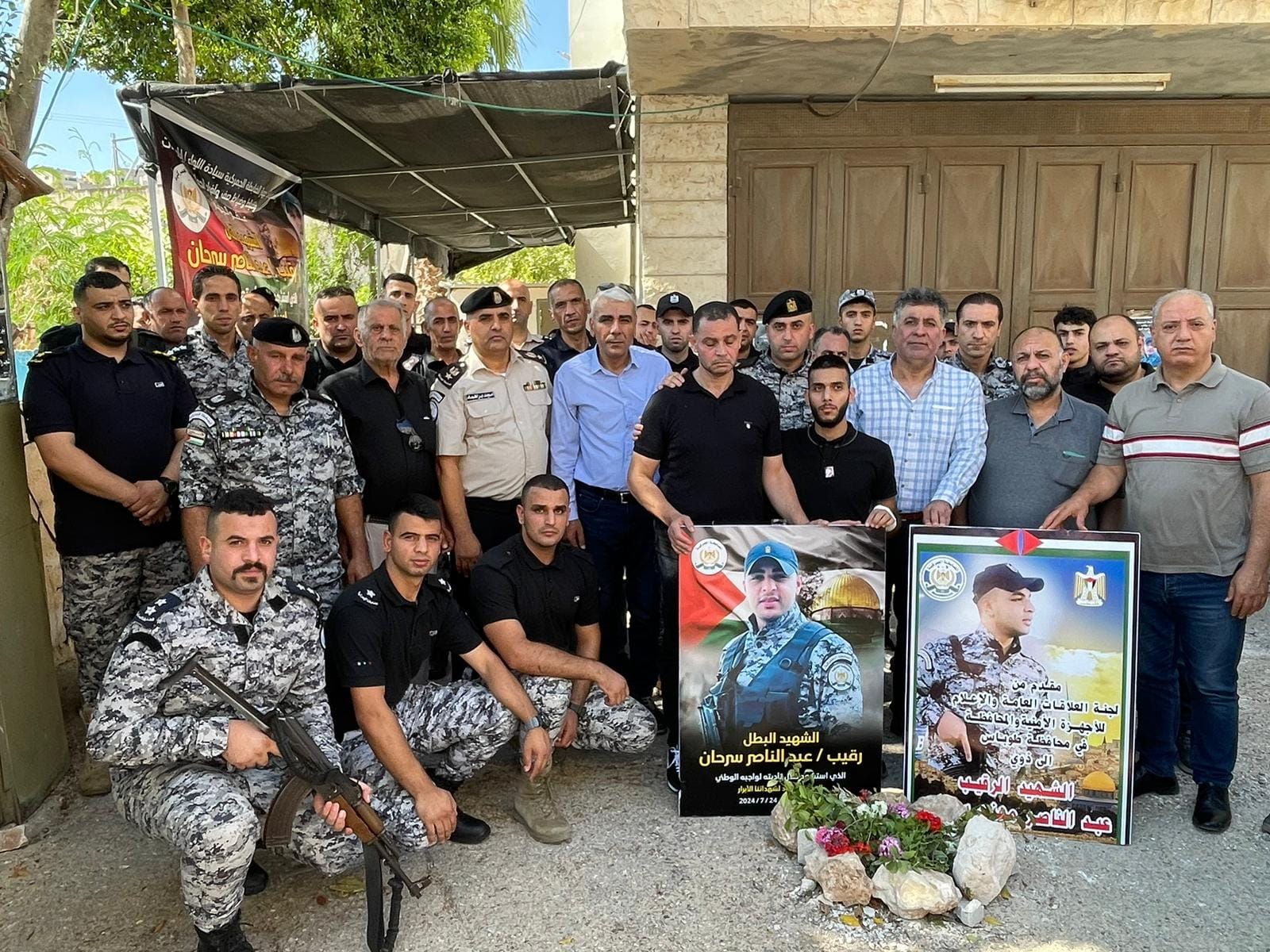 Ramallah - 7/29/2024 Today, Monday, the Customs Police Service held a funeral home for the martyr, Sergeant Abdel Nasser Sarhan, who was martyred while carrying out his national duty in the Fatah movement’s territory in Tubas Governorate, in the presence of the martyr’s family and relatives. The Governor of Tubas, Brother Ahmed Al-Asaad, the Secretary of the Fatah Movement, Brother Mahmoud Sawafta, directors of the security institution, and a large number of officers and members of the security institution, in addition to representatives of the factions, official and civil institutions, and the people of the governorate, participated in the condolences.