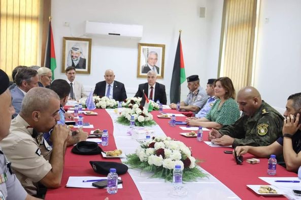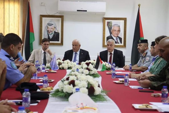The Minister of Interior, Major General Ziad Hab Al-Rih, briefed the European Union Representative to the State of Palestine, Alexander Stutzman, and the Head of the European Police Mission, Karin Limdahl, on the general situation in the governorate as a result of the recent aggression on the governorate, in the presence of the Assistant Governor, Ahmed Al-Qassam, the Director General of Police, Major General Allam Al-Saqa, the Director General of Civil Defense, Major General Al-Abd Ibrahim Khalil, the Commander of the Customs Police, Major General Iyad Barakat, and the directors of the security services in Jenin.