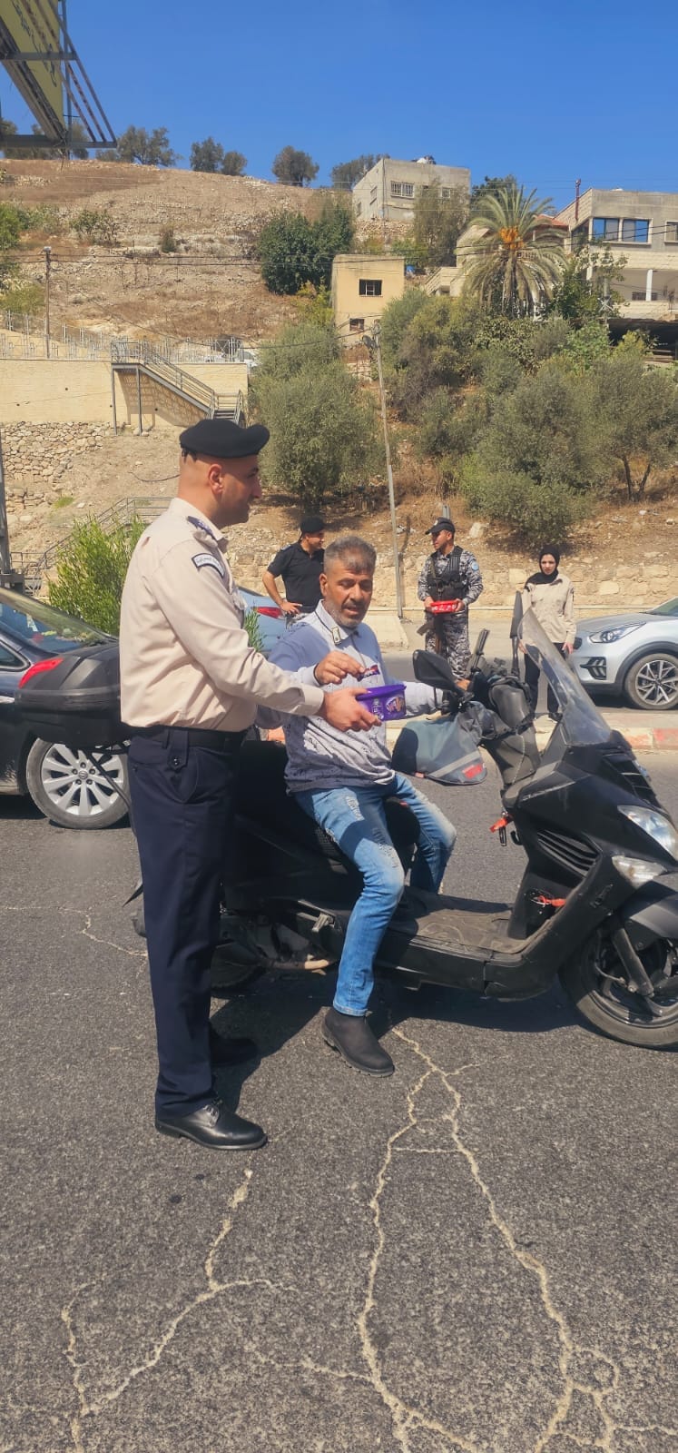 Ramallah - 9/27/2023 The customs police force in the various governorates of the country, in cooperation with the security institution and the Palestinian Ministry of Endowments and Religious Affairs, today, Wednesday, distributed sweets to citizens, drivers, and passers-by. On the occasion of the anniversary of the Prophet’s birthday.