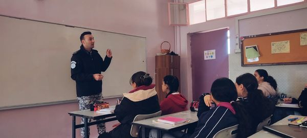 Ramallah - 3/20/2024 The Customs Police Service, in cooperation with the Political and National Guidance Authority, presented an awareness lecture to the students of Bint Al-Azwar Girls’ Higher Basic School in Ramallah and Al-Bireh Governorate, today, Wednesday, from which (40) students benefited. Within the control program to spread customs awareness.