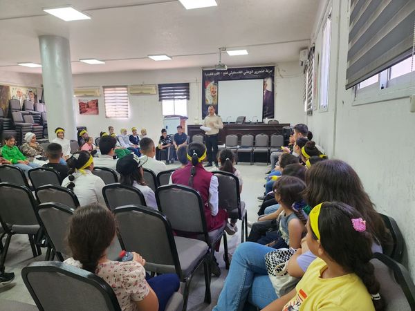Ramallah - 7/21/2024 The Customs Police gave an awareness lecture to the students of the “Cubs and Flowers” summer camp, affiliated with the Fatah movement, today, Sunday, in Qalqilya Governorate, from which (60) male and female students benefited.