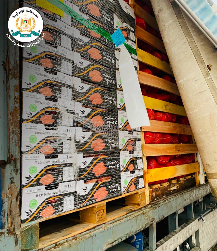 رام الله _ 26/12/2022 ضبط جهاز الضابطة الجمركية، خلال عمله على إحدى الحواجز في محافظة نابلس، اليوم الإثنين، شاحنة محملة بـأكثر من 5 طن ونصف فواكة بدون تصريح نقل زراعي.