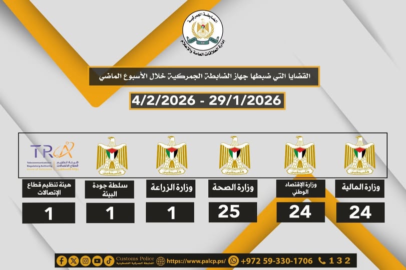رام الله - 16/2/2026 قدم جهاز الضابطة الجمركية، محاضرة توعوية لطلاب مدرسة ذكور قبيا الثانوية، اليوم الاثنين في محافظة رام الله والبيرة، استفاد منها (60) طالب.
