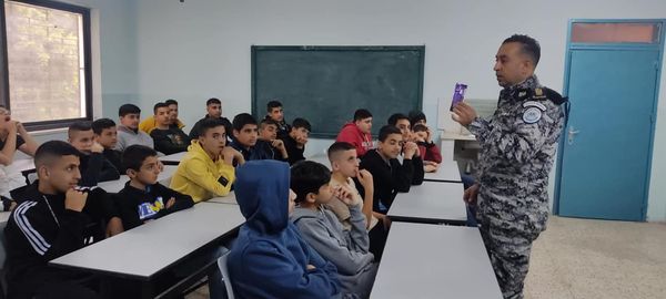The customs police gives an awareness lecture to the students of the Al-Bireh Sharia Boys’ School in Ramallah and Al-Bireh