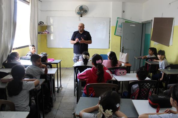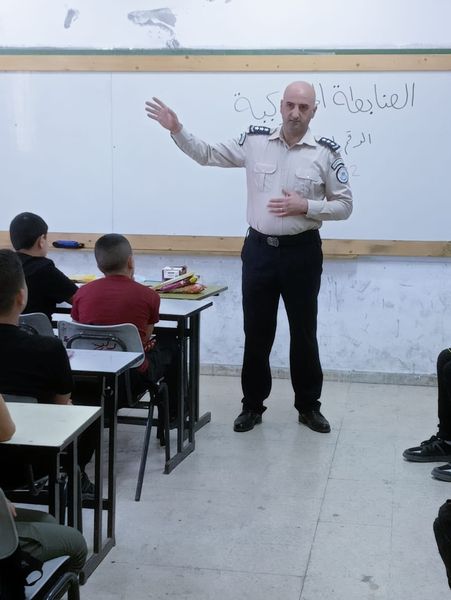 The customs police gives an awareness lecture to students of Abu Muwais Basic Boys School in Jenin