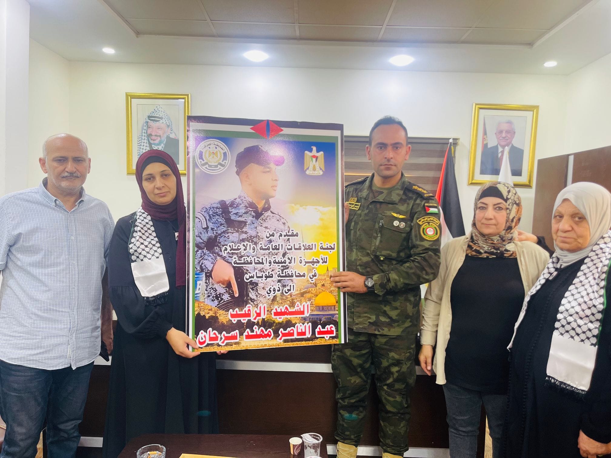 Ramallah - 7/29/2024 Today, Monday, the Customs Police Service held a funeral home for the martyr, Sergeant Abdel Nasser Sarhan, who was martyred while carrying out his national duty in the Fatah movement’s territory in Tubas Governorate, in the presence of the martyr’s family and relatives. The Governor of Tubas, Brother Ahmed Al-Asaad, the Secretary of the Fatah Movement, Brother Mahmoud Sawafta, directors of the security institution, and a large number of officers and members of the security institution, in addition to representatives of the factions, official and civil institutions, and the people of the governorate, participated in the condolences.