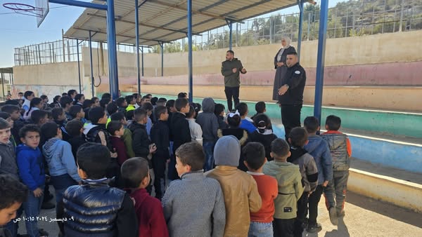 Ramallah_10/12/2024 The Customs Officer, in cooperation with the Political and National Guidance Authority, gave an awareness lecture to students of Tayasir Mixed Elementary School, today, Tuesday, in Tubas Governorate, from which (70) male and female students benefited.
