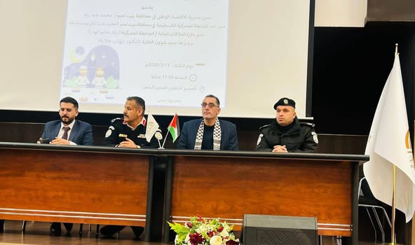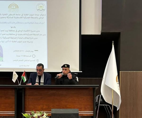 The seminar was attended by the Director of the Customs Police in Bethlehem, Lieutenant Colonel Abdul Karim Yasaytah; the Director of the National Economy, Mr. Muhammad Hamida; the Dean of Student Affairs, Dr. Ihab Khalayleh; the Head of the Activities Department at the University, Prof. Bahaa Arman; and the Public Relations Officer for the Customs Police in Bethlehem, Major Hatem Al-Hadri, along with a number of students.