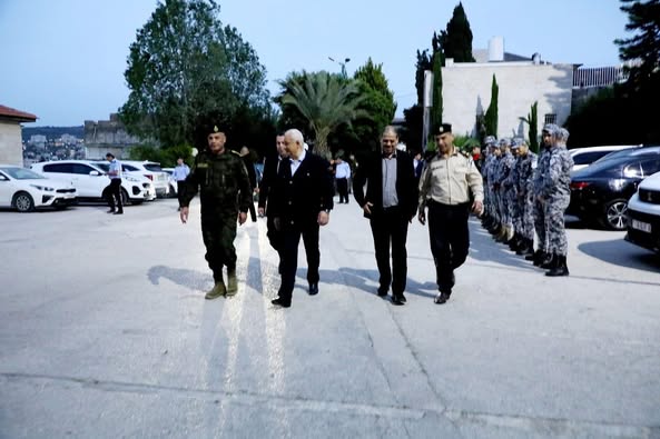 Ramallah - April 7, 2025 - The Director of the Customs Police in Salfit Governorate, Lieutenant Colonel Saed Jibril, participated in the welcome of His Excellency the Minister of Interior, Major General Ziad Hab al-Rih, today, Monday, at the Governorate building. The meeting was attended by His Excellency the Governor of Salfit Governorate, Mr. Mustafa Taqatqa, the region commander, and the directors of the governorate's security establishment.