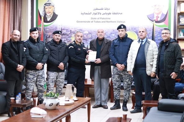Ramallah _ 5/2/2023 The customs police force, represented by the Director of the Tubas Directorate, Col. Radhi Kettaneh, delivered today, Sunday, the annual report of the customs police's achievements and work for the year "2022" to the Governor of Tubas Governorate, Major General Younis Al-Aas at the governorate house.