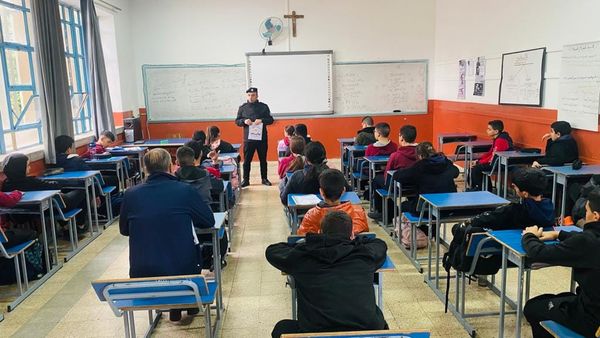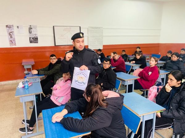 Ramallah - 11/28/2023 The Customs Police gave an awareness lecture to the students of Terra Santa College in Bethlehem Governorate today, Tuesday, from which (35) male and female students benefited. Within the control program to spread customs awareness.