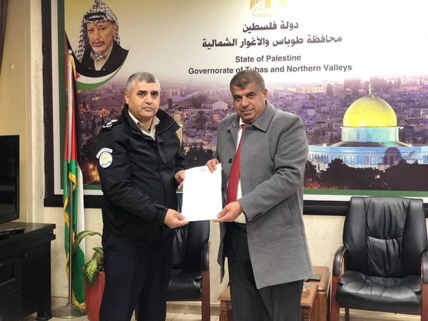 Ramallah - 12/2/2024 The Customs Police Service, represented by the Director of the Tubas Directorate, Lieutenant Colonel Amjad Barahma, delivered the annual report on the achievements of the Customs Police and its work for the year “2023” to the Acting Governor of Tubas Governorate, Brother Ahmed Al-Asaad, today, Monday, at the Governorate House.