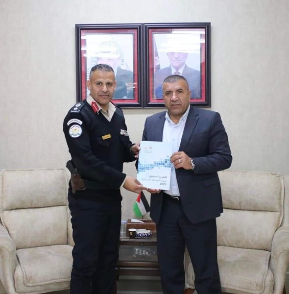 Ramallah - 2/13/2024 The Customs Police Service, represented by the Director of the Hebron District, Lieutenant Colonel Abdel Karim Basita, delivered the annual report on the achievements of the Customs Police and its work for the year “2023” to the Acting Governor of the Hebron Governorate, Brother Khaled Dudin, today, Tuesday, at the Governorate House.
