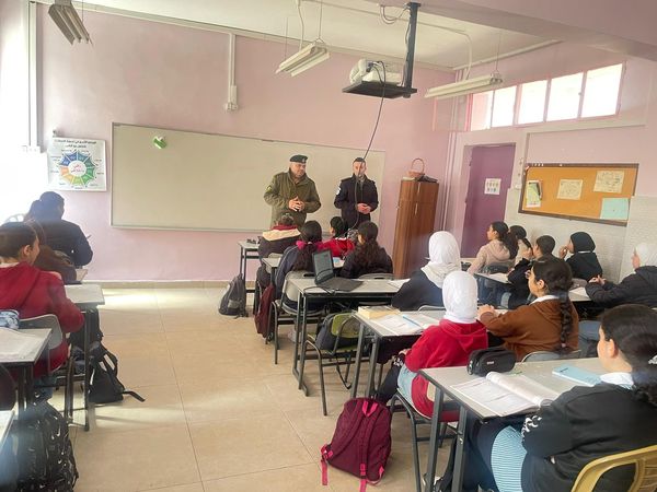 Ramallah - 3/20/2024 The Customs Police Service, in cooperation with the Political and National Guidance Authority, presented an awareness lecture to the students of Bint Al-Azwar Girls’ Higher Basic School in Ramallah and Al-Bireh Governorate, today, Wednesday, from which (40) students benefited. Within the control program to spread customs awareness.
