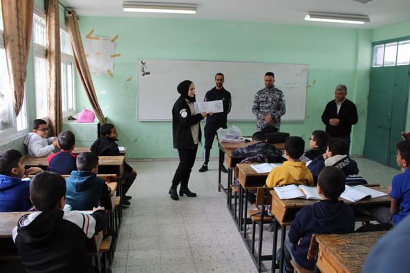 Ramallah - 3/26/2024 The Customs Police gave an awareness lecture to the students of Al-Ain Camp Boys School in Nablus Governorate, today, Tuesday, from which (65) students benefited. As part of the police officer’s program to spread awareness about the nature of her work and her role in protecting markets and combating tax evasion and customs smuggling.