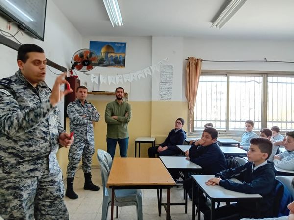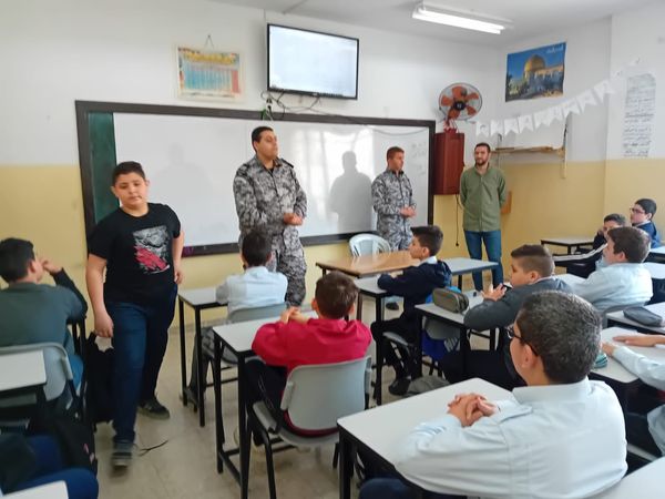 Ramallah - 4/2/2024 The Customs Police gave an awareness lecture to students of the Islamic Basic School for Boys in Nablus Governorate, today, Tuesday, from which (40) students benefited. As part of the police officer’s program to spread awareness about the nature of her work and her role in protecting markets and combating tax evasion and customs smuggling.