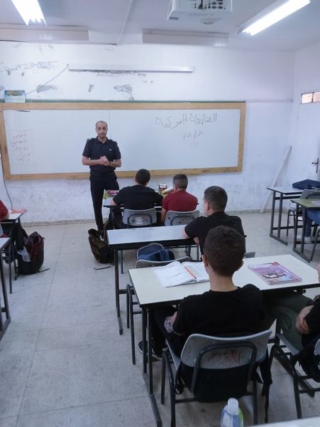 Ramallah - 5/8/2024 The Customs Police gave an awareness lecture to the students of Abu Muwais Basic Boys School, today, Wednesday, in Jenin, from which (35) students benefited. As part of the police officer’s program to spread awareness about the nature of her work and her role in protecting markets and combating tax evasion and customs smuggling.